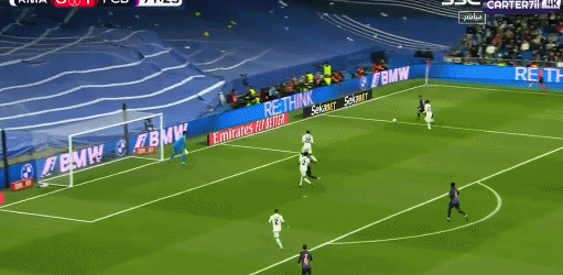 我们从慢镜回放来看,凯西这是必进之球——皮球朝着库尔图瓦的另一侧而去,库尔图瓦的站位已经完全偏离,纵然有2米身高,也无法覆盖球门7.32米的宽度。要不是法蒂左脚一挡,帮助皇马解围,凯西都可以庆祝进球了。