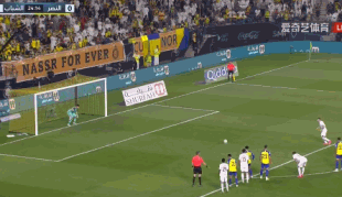 第33分钟,对方后卫禁区外手球犯规,C罗主罚任意球大力抽射被人墙挡出。外围利雅得胜利再起球传中,C罗甩头攻门,球被横梁挡出。