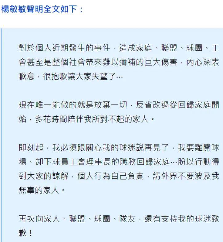 北京时间6月19日消息,P+联赛新北国王队当家球星、球员工会理事长杨敬敏,近日被爆出习惯性出轨女粉丝,造成了非常恶劣的影响。杨敬敏随后发文道歉,宣布离开球场。