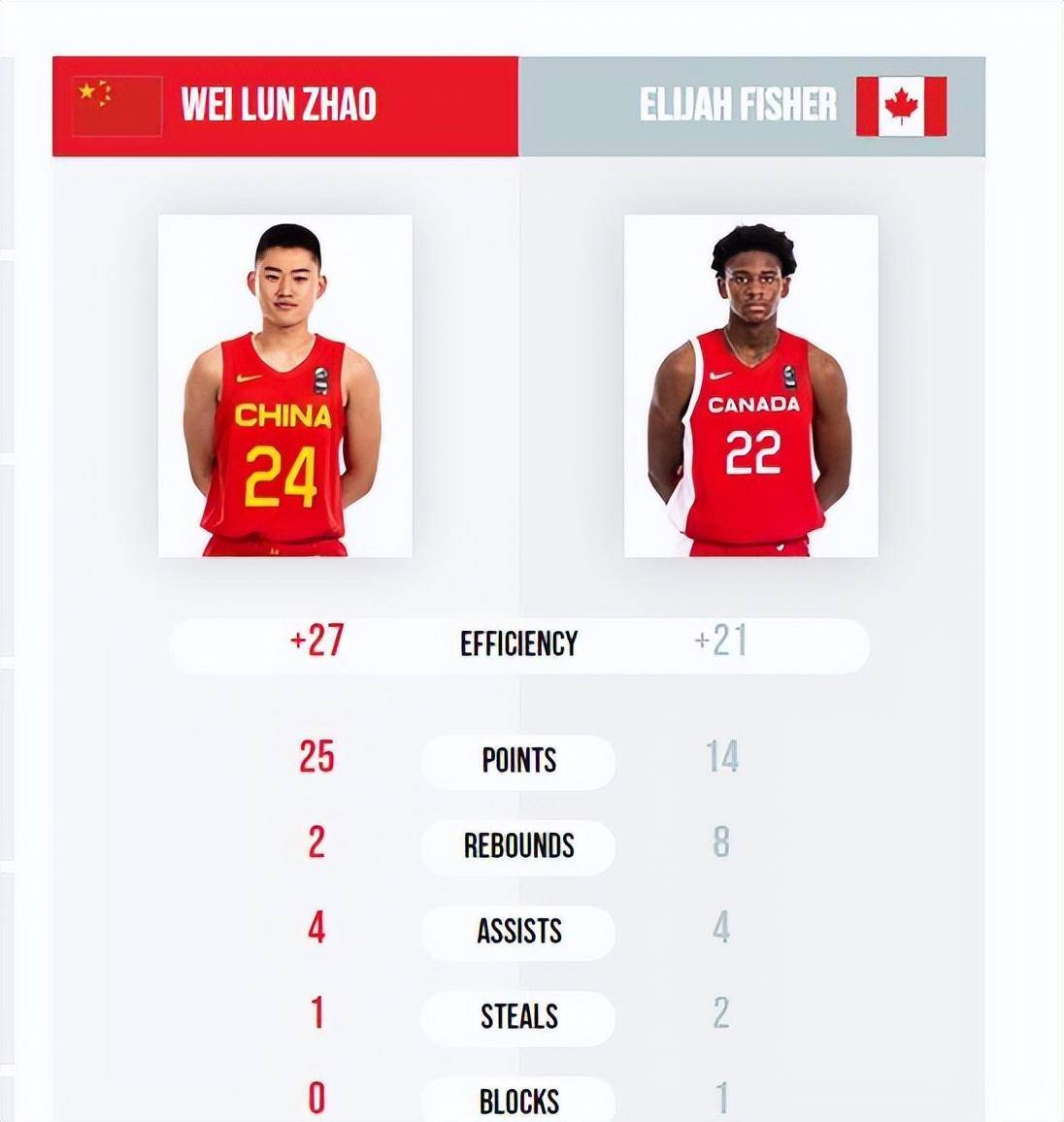 赵维伦替补出场,他上场后一记上篮得分,然后连续送出助攻,又投进一记三分球,表现可圈可点。赵维伦还有一次制造犯规,罚球2中1。中国队第一节20比23落后。第二节比赛,张维伦上场时间不多,国青男篮哑火,被加拿大队打了一个18比8。