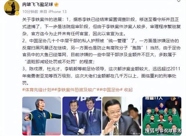 今日,媒体人冉雄飞爆出多个猛料,首先表示李铁被移至看守所后,已经被正式逮捕了,下一步是法院庭审阶段,其次是陈戌源、杜兆才、李毓毅等前足协领导的涉案金额都在几千万以上,面临重判的刑事处罚,最后足协几十个中层干部的私人护照被“统一管理”,防止连夜跑路。