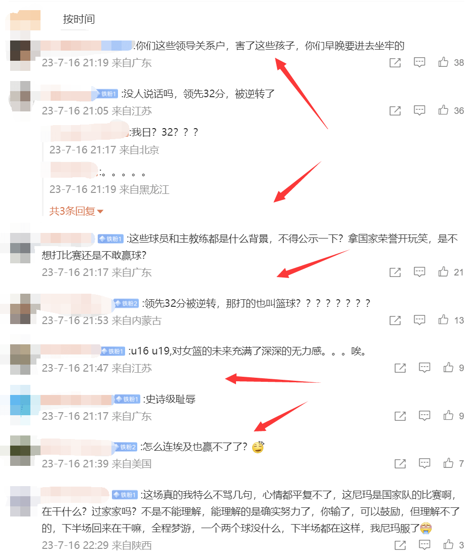 第2条高赞评论:“这些球员和主教练都是什么背景,不得公示一下吗?拿国家荣誉开玩笑,是不想打比赛还是不敢赢球?”、“领先32分被逆转,那打的也叫篮球?”、“U16,U19,对女篮的未来充满了深深的无力感。”、“史诗级大耻辱。”、“这场真的我不骂几句心情都平复不了,这是国家队的比赛啊,在干什么?过家家吗?不是不能理解,能理解的是确实努力了,你输了,可以鼓励,但理解不了的,下半场回来在干嘛,全程梦游,不想赢?”