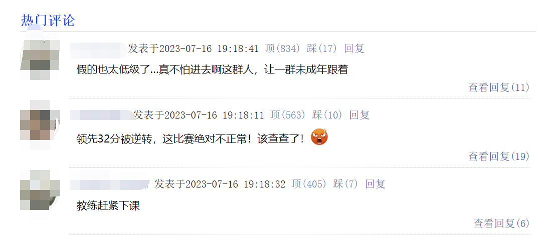 还有网友怒斥:“我宁愿相信这场假球,否则你让我说什么,相信女篮的后备力量真的就这种实力吗?”、“这假的也太低级了,你们这群人真不怕进去吗?一群未成年人的未来就被你们这么祸害了。”、“绝口不提32分逆转吗?不查查怎么回事嘛?U16第六不说说怎么回事吗?集训大半年,企业赞助120万,最后这个成绩?不交代一个?”、“最多领先32分,第三节8分第四节4分,末节体力不支被埃及逆转。出于练兵原因,主教练下半场一个暂停没叫,队员拼尽全力,无奈埃及队这个这届排名垫底的对手太强?是这样吗?”