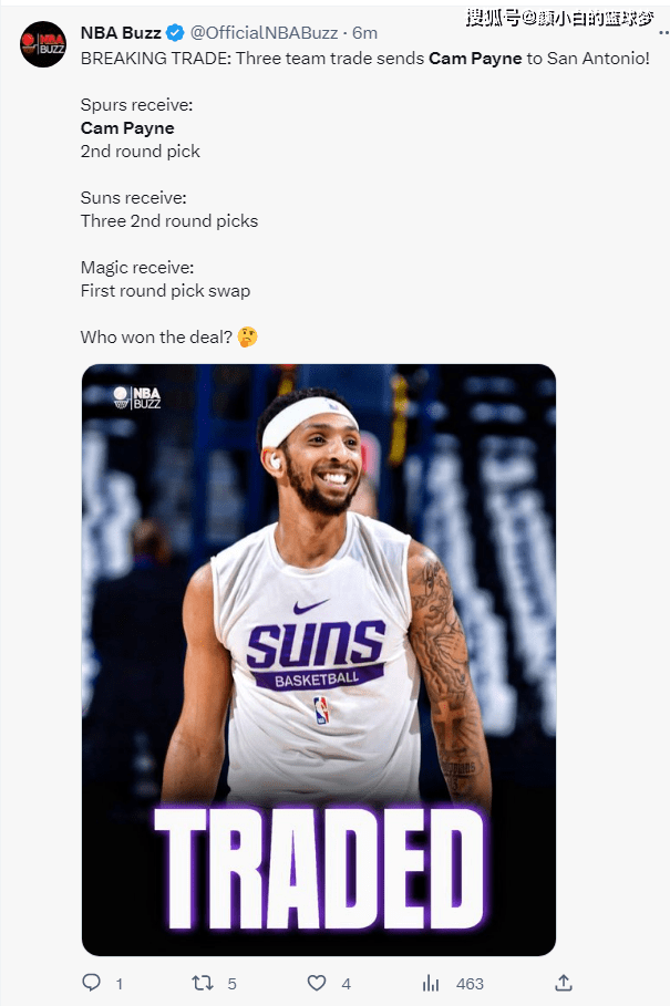 马刺得到佩恩、1个未来次轮;太阳得到三个未来次轮;魔术得到太阳2026年首轮互换权。