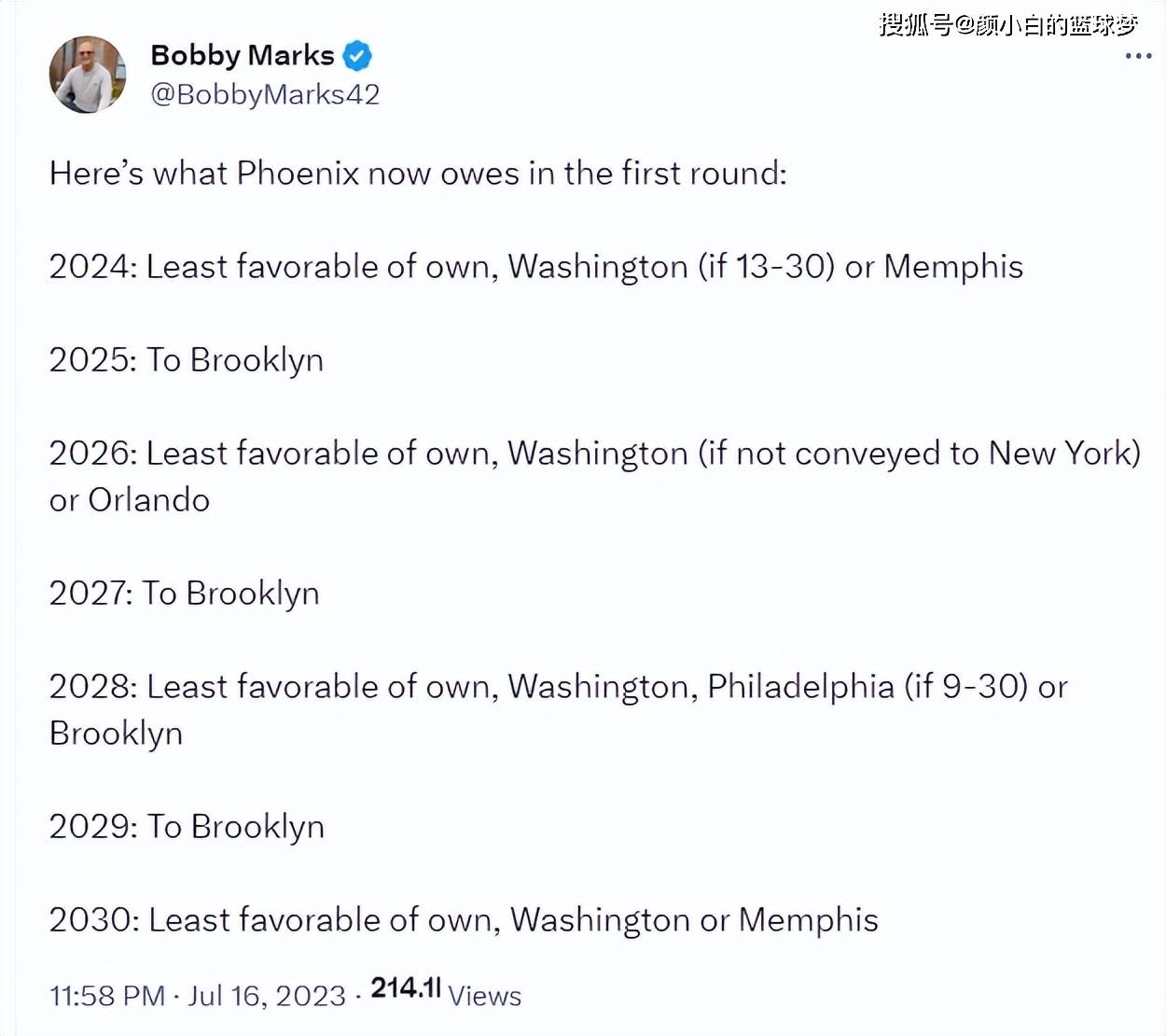 但太阳也等于是在豪赌未来,2024年首轮互换权在奇才,2025年首轮在篮网,2026年首轮互换权奇才/灰熊,2027年首轮在篮网,2028年首轮互换在奇才(费城9-30保护)、篮网;2029年首轮在篮网;2023年首轮互换权奇才/灰熊。