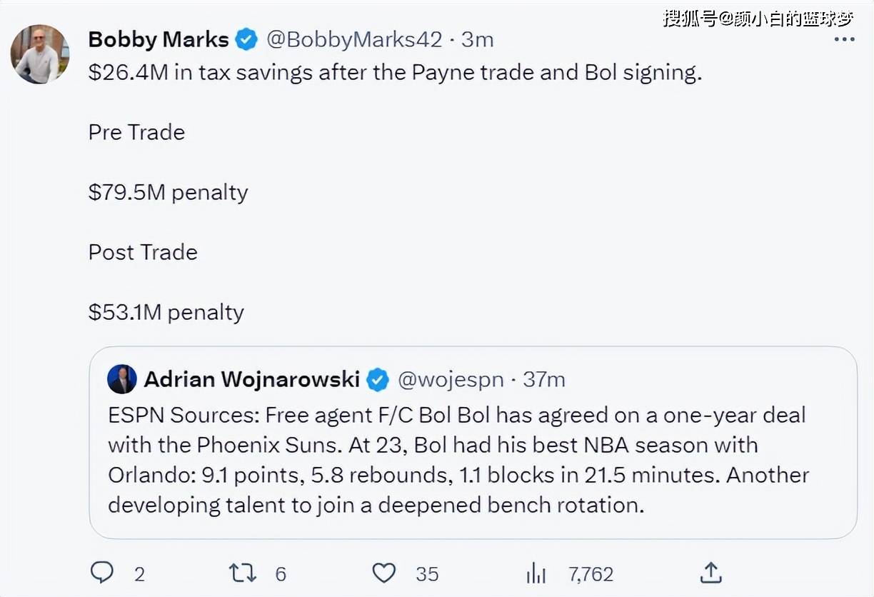 薪资结构专家鲍比-马克斯分析:太阳的运作等于是送走650万的佩恩换来一个底薪的波尔,交易之前太阳奢侈税7950万,交易达成后签下波尔奢侈税还剩5310万,换言之交易让太阳节省2640万的奢侈税。
