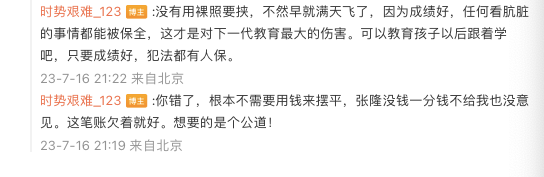 张隆前妻表示,她想要的是一个公道,“张隆没钱一分钱不给我也没意见。这笔账欠着就好。想要的是个公道!因为成绩好,任何看肮脏的事情都能被保全,这才是对下一代教育最大的伤害。可以教育孩子以后跟着学吧,只要成绩好,犯法都有人保。”