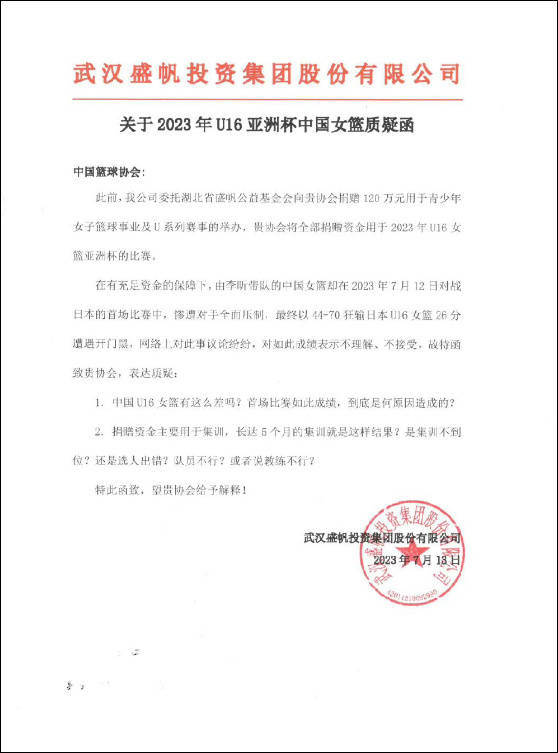 彼时向U16女篮捐赠120万元的武汉盛帆集团发文抛出七问:“中国U16女篮有这么差吗?首场比赛如此成绩,到底是何原因造成的?”