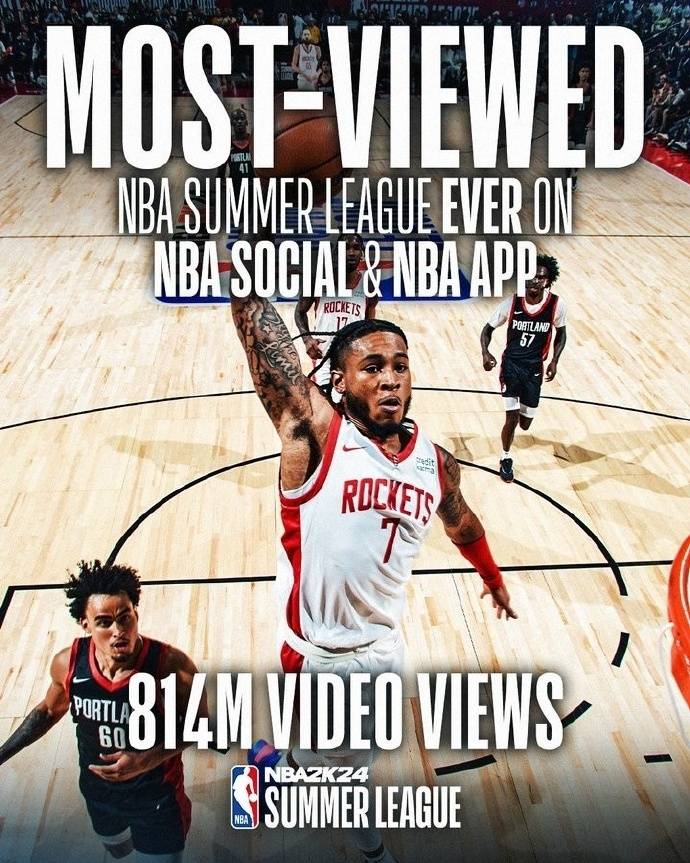 NBA官方发文表示:“今年夏季联赛是NBA有史以来观看人数第二多的夏季联赛,其中在NBA社交媒体平台和NBA APP上共产生8.14亿次视频观看次数,创下夏季联赛历史最高纪录。”