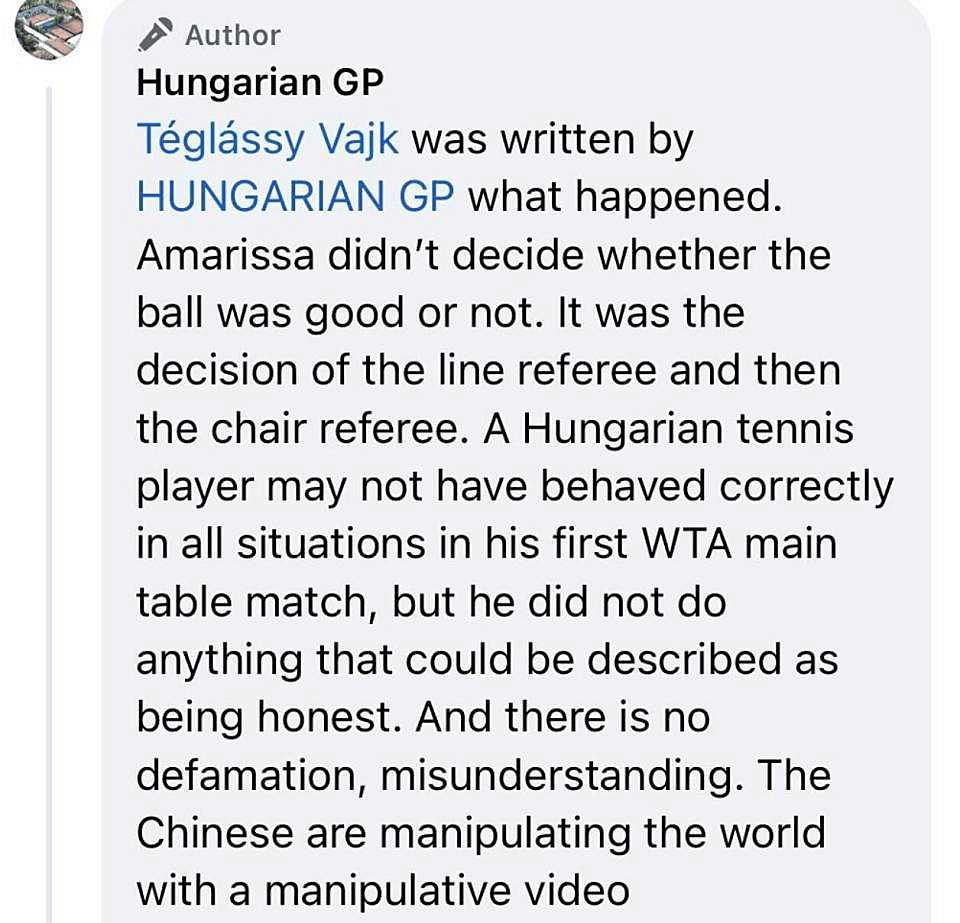 赛后,托特在接受采访时,向外界指责是张帅故意搞事情,自己不明白张帅为什么要大惊小怪,想要推翻裁判的判罚,自己不明白张帅为什么不接受这样的判罚,还给自己找麻烦。匈牙利本土媒体Radio Kossuth也在报道中指责张帅误导外界,对张帅进行了冷嘲热讽。最令人气愤的是,布达佩斯赛的官方在声明中掉颠倒黑白,表示这是托特第一次参加巡回赛,虽然她的有些行为不当,但她也没有做出任何不诚信的行为,也不存在欺骗和误解。最过分的是,布达佩斯赛的官方最后还表示中国人在用一个视频欺骗全世界。什么叫中国人在用一个视频欺骗全世界?布达佩斯赛的官方难道不知道发出这样的声明意味着什么吗?难道托特第一次参加巡回赛就可以做出不尊重张帅的行为?又或者官方允许这样的行为出现,甚至还往中国人身上泼脏水?