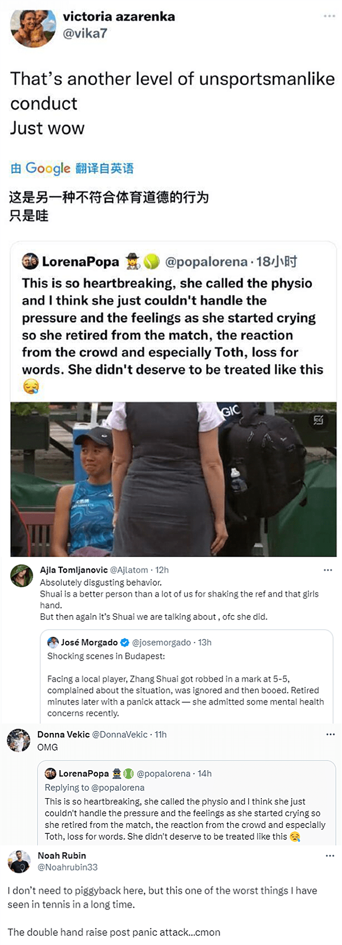 张帅退赛惹争议!多位名将力挺,官方发文嘲讽,中国人欺骗全世界。2023年WTA250布达佩斯站首轮,中国名将对阵东道主匈牙利选手托特,此役张帅多次遭遇争议判罚,甚至还出现了很明显的误判,并且托特还做出了非常不友好的举动,无视张帅保留球印的申请,直接用脚擦掉了球印,最终张帅含泪退赛,可令人意外的是张帅退赛引起了非常大的争议,托特和匈牙利媒体,以及比赛官方都对张帅进行了嘲讽。