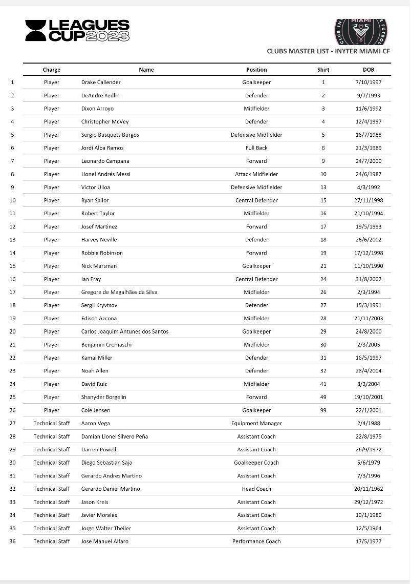 赛前,迈阿密国际官方公布了本场比赛的大名单,梅西、布斯克茨、阿尔巴均在列。