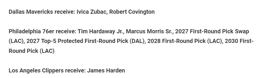 76人得到:小蒂姆-哈达威,马库斯-莫里斯,2027年首轮互换权(来自快船),2027年前5保护的首轮签(来自独行侠),2028年首轮签(来自快船),2030年首轮签(来自快船)。