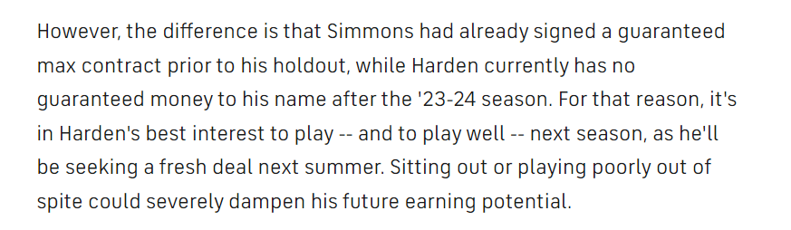 不同之处在于西蒙斯在申请交易前就签下了一份有保障的顶薪合同,而哈登在2023-24赛季之后还没有保障合同。出于这个原因,Kaskey-Blomain表示哈登下赛季必须要打出好成绩,他无法强硬地拒绝前往训练营报到,那样只会削弱他的收入潜力。从这一点来看,哈登的个人处境不如当初的西蒙斯。
