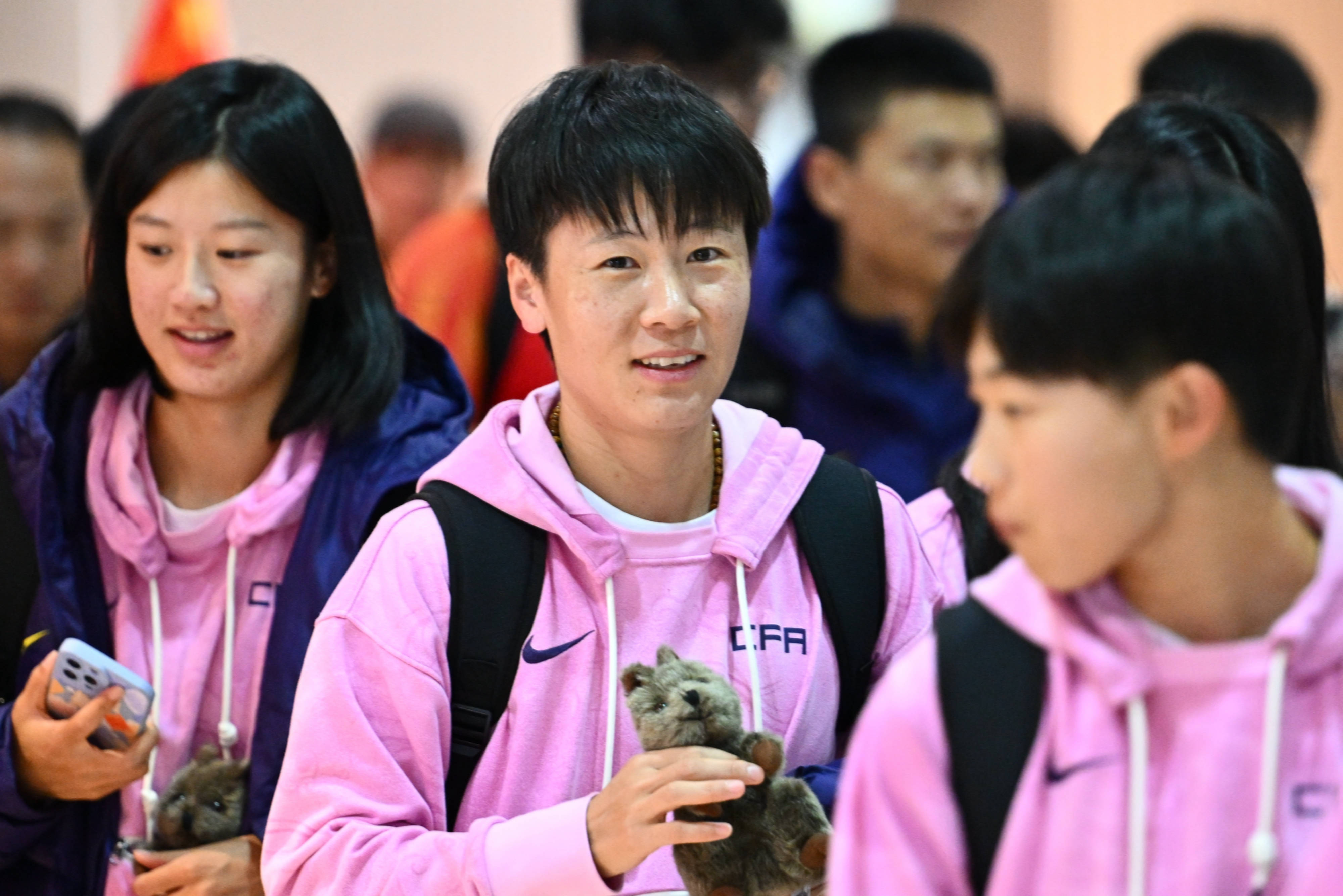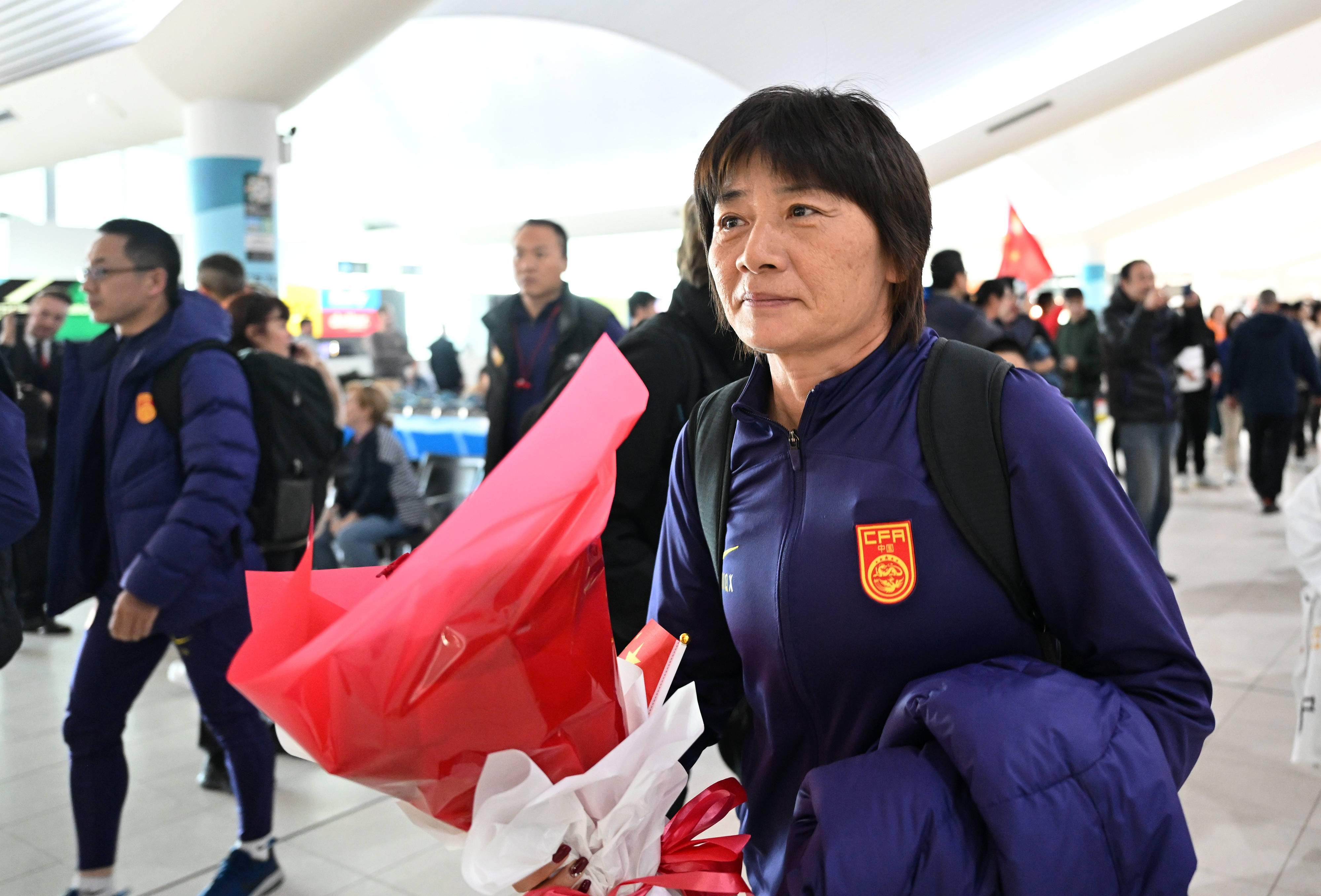 下午3点,中国队人员走出机场,姑娘们神态轻松,粉色卫衣口袋中都装有一个考拉玩具。到达大厅里,20多名当地华人华侨球迷整齐地喊着“中国队加油!”“中国队必胜!”吴海燕边走边拍摄,王霜和主教练水庆霞则耐心地给球迷签名。