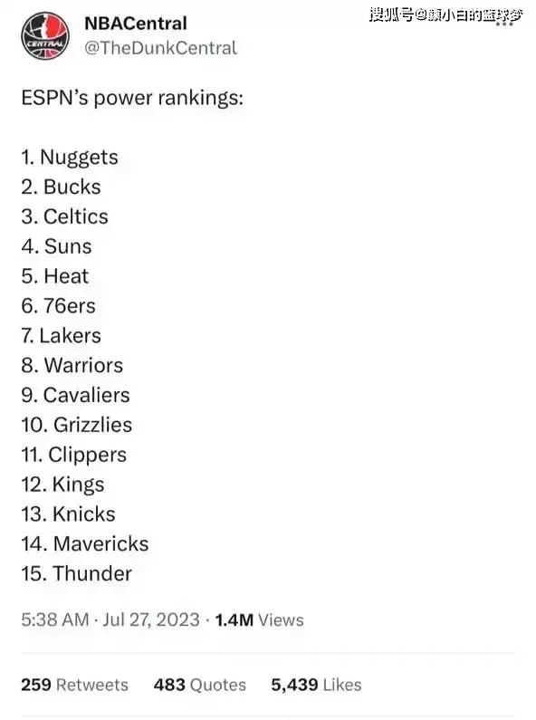 ESPN最近公布了他们在新赛季预测的实力榜单,根据休赛期每一个球队的补强进行了实力的排名。其中卫冕冠军掘金队高居榜首,湖人队也是力压勇士排在第7。