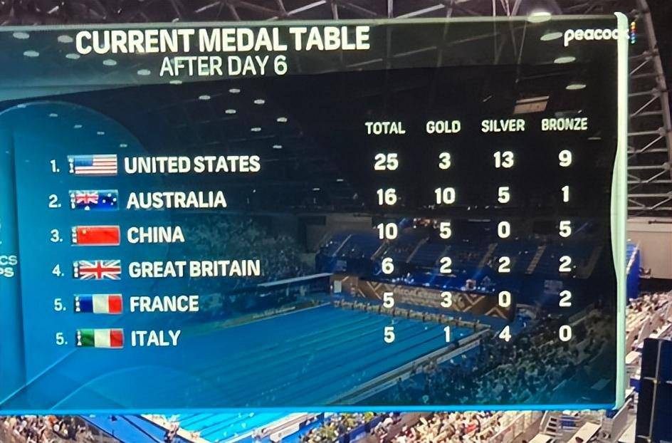 不过美国媒体却“别出心裁”。在倒数第二个比赛日结束之后,美国媒体NBC的转播画面显示,美国队在奖牌榜上已经高居第一!乍一想令人诧异,美国队3金15银13铜,金牌数不是第一,奖牌数也不是第一,为何能排第一?原来,NBC将游泳单独列了出来,而且还不是计算金牌数,而是计算奖牌数。不得不佩服NBC转播团队,将一次大败说成了一次大胜!