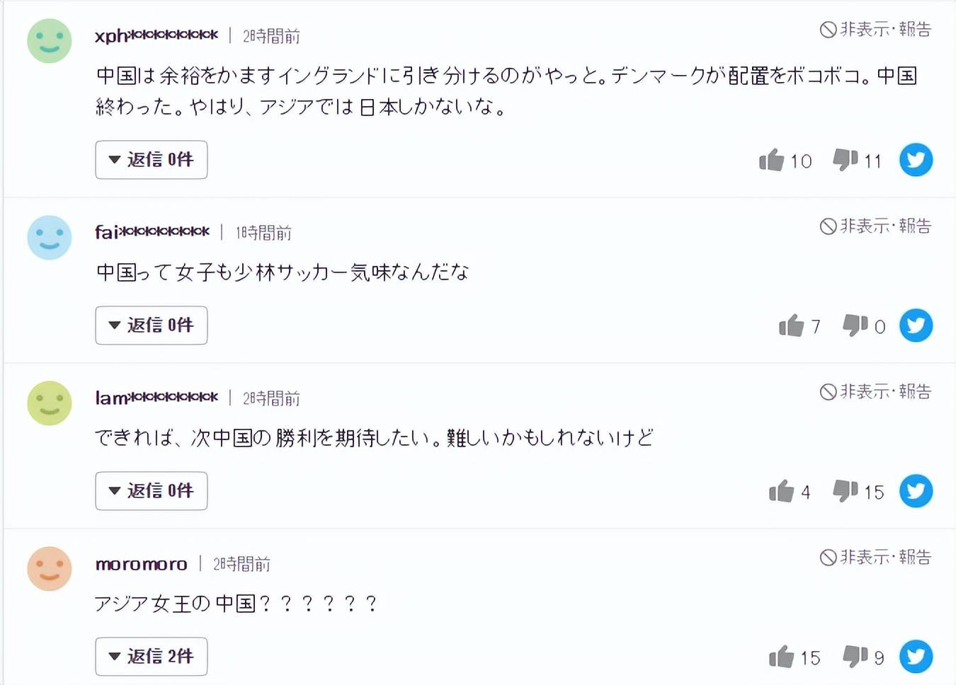 而英格兰女足贵为欧洲冠军,又岂是那么容易击败,所以对于中国女足的前景,很多球迷都不看好。在日本《雅虎体育》的评论区,日本的球迷们就纷纷留言,对中国女足进行了吐槽。有球迷评论道:“就算中国女足最后一轮逼平英格兰女足,她们也没戏,输给丹麦队太致命了,全亚洲应该只有日本女足能够出线了。”也有球迷写道:“我还挺想看中国女足击败英格兰女足的,但那也许只能在梦里实现了!”也有球迷表示:“在中国,甚至女孩子都会‘少林足球’(指张睿踢人染红)!”