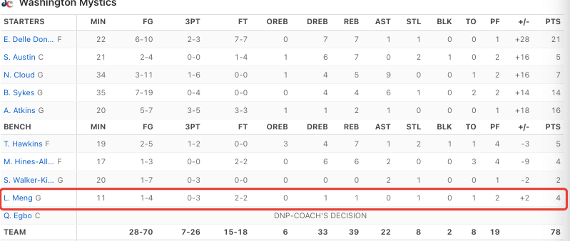 李梦在神秘人的生涯并没有迎来新的转机,如今,她已经沦为球队的第四替补。在神秘人78-62爆冷击败领头羊王牌的比赛中,李梦只打了11分钟,4投1中,三分3中0,只得4分1抢断1篮板。