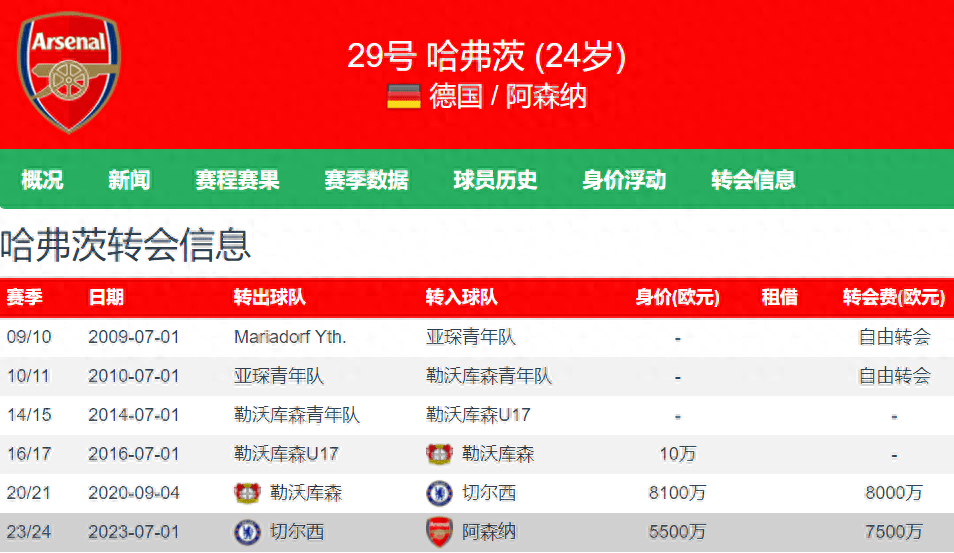 今年夏窗,在切尔西发展未达预期的哈弗茨,竟然得到了阿森纳主帅阿尔特塔的青睐,后者力荐阿森纳签下这位德国前锋,不仅转会费高达7500万欧元,阿森纳还给了队内顶薪,高达33万英镑(年薪2000万欧元 ),在整个英超都是顶级薪水之一。