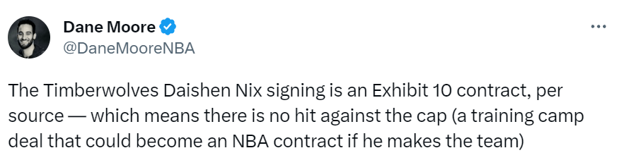 北京时间9月18日, 据名记Shams报道,森林狼和后卫戴申-尼克斯签下一年合同。在火箭效力两个赛季后,尼克斯将前往森林狼训练营报到。森林狼记者Moore跟进报道称,消息人士透露,森林狼与尼克斯签下的是一份Exhibit 10的训练营合同,这意味着这笔签约不会影响工资帽(如果他入选球队的最终阵容,训练营合同可转正)。