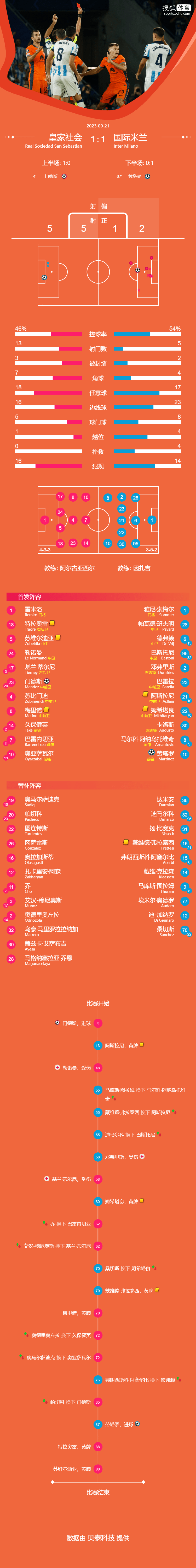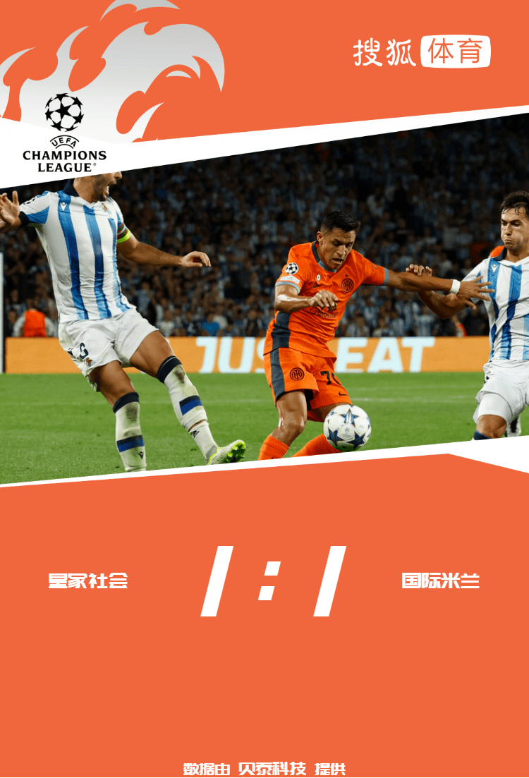 全场比赛结束,国际米兰客场艰难地1-1战平皇家社会。