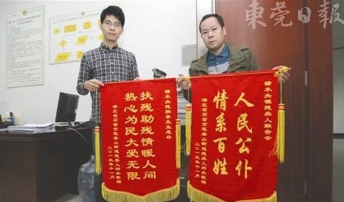 昨日上午,湖北籍新莞人邱杰拄着拐杖,将两面锦旗分别送给樟木头残联及工作人员李志伟。据他介绍,在来樟木头之前,他曾辗转珠三角多地求职,但都无果而终,最终还是在樟木头残联的帮助下,在该镇找到了工作。