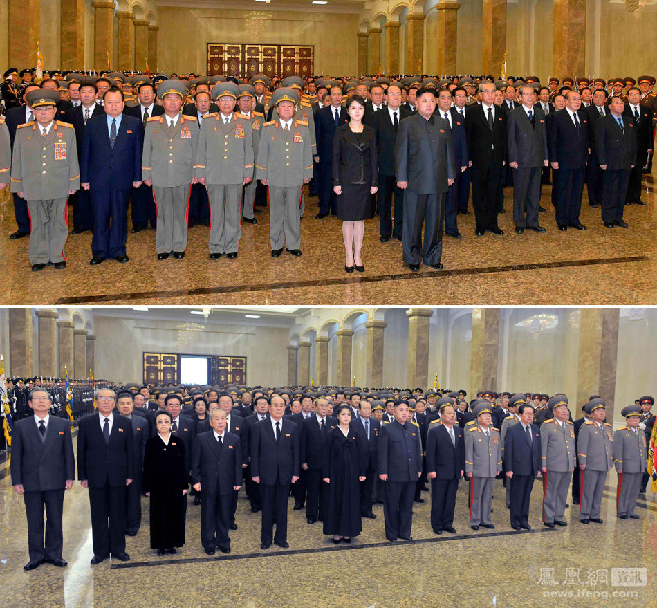 (上图)2013年12月17日,金正日逝世2周年之际,李雪主随金正恩参谒了金日成和金正日遗体的锦绣山太阳宫。(下图)为2012年12月17日,金正日逝世1周年之际,李雪主随金正恩参谒了金日成和金正日遗体的锦绣山太阳宫。