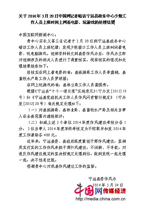 宁远县作风办田主任告诉本网:“根据《宁远县“十个一律处理”实施意见》(宁办发[2012]19号)和《宁远县党政机关工作人员作风问责暂行规定》(宁办发[2012]20号)有关规定,对县旅游局、县林业局、县畜牧水产局及相关当事人在全县范围内通报批评,扣减上述3个单位2014年度作风建设考核分各1分, 3名当事人2014年度年终考核定为不称职并扣发2014年度工作津贴各400元。(本网 宗长义)