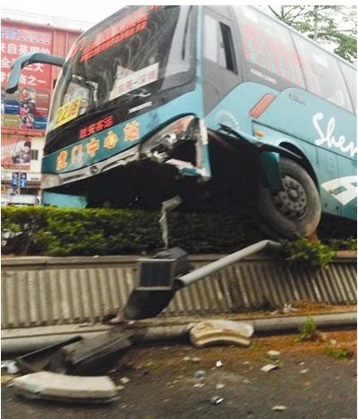 “那个地方正好处在一个斑马线路口,路中间的绿化带正好有个缺口,要不是有缺口,那辆大巴车会侧翻,而上不了绿化带。”雷先生说。“那辆大巴车是为了避让一个骑电单车的男子,突然从中间车道转入快车道才上了绿化带的。那个骑车男子当时也吓得从电单车上摔倒下来,躺在车旁边的路面上,如果大巴侧翻,必压在那个骑电单车男子的身上。”雷先生说。