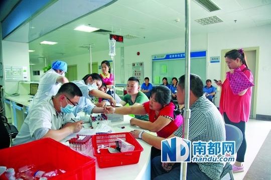 由于突然有近百名亲朋好友出现上吐下泻的情况,他们大多数人被送到了大朗医院。这使得大朗医院输液区变得很拥挤。不少人坐在护士站旁的椅子上打点滴。护士说:“人太多了,没办法,只好连护士站也利用起来。”在走廊上,临时增加的多张病床排成一排,医护人员显得有点手忙脚乱。“从症状上看,有点像食物中毒。”大朗医院的医生说。
