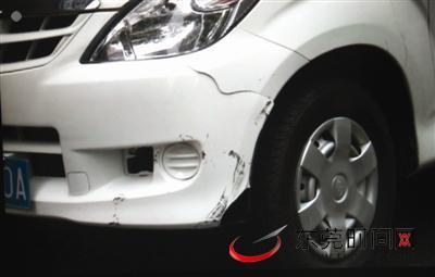 杨先生的轿车车灯附近被撞裂。(记者 赵浛锐 摄)