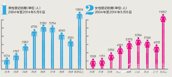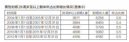 晚婚 初婚年龄推迟,“剩男剩女”群体扩大 “毫无疑问,男性、女性的平均初婚年龄都在推迟。”东莞理工学院城市学院社会工作教研室赖沛东说。 数据显示:2006年至2007年,主城区初婚年龄在28周岁以上的男性有3584人,占同时段初婚男性总人数42.33% ;2008年至2009年,初婚年龄在28周岁以上的男性有4586人,占同时段初婚男性总人数46.8%;2010年至2011年初婚年龄在28周岁以上的男性有4666人,占同时段初婚男性的51.3%;2012年至2013年,初婚年龄在28周岁以上的男性有4356人,占同时段初婚男性的53.2%(详见图表8)。 国家《婚姻法》规定,男性初婚年龄不得低于22周岁,推迟三年为晚婚。如果我们再推迟三年把28周岁以上视为“剩男”的话。显然,从2006年至2013年,初婚28周岁以上的群体呈扩大趋势。 女性亦如此。初婚年龄26周岁以上的人群占同时段初婚女性比例,也呈现上升趋势(详见图表9)。 专家分析 婚姻与“性”、“生育”不再捆绑 ——深圳大学法学院社会学系教授 易松国 晚婚现象的产生与东莞经济社会发展现状是紧密相连的。它与几个社会因素有关联:首先,青年受教育年限高了。这个很好理解,大学毕业后,更多的青年修读硕士、博士。虽说大学以上学府不限制结婚,但是很多青年人以“学业为重”也会推迟了婚龄;第二,经济因素作用力。就业压力大,城市青年更多选择有一定经济积累,比如买房子之后,才考虑组建家庭;第三,结婚观念的变化。大家对“结婚”认识与上世纪七八十年代早已不同,更多看做一个形式,没有那么“大件事”。也不再是与“性”、“生育”捆绑在一起。换句通俗的话说,晚婚或者不婚,不代表就没有性伴侣,也不一定就没有养育孩子。 社会压力大是导致晚婚主要原因 ——东莞理工学院城市学院宣传部部长 何鹏举 晚婚,说明几个问题,一是过去“传宗接代”责任和观念在淡化。年轻人把婚姻看作个人的事情,有种“我的地盘我做主”的意思。第二,社会节奏快,社会压力大,也使得青年人成家需要做的准备也多。过去,毕业分配到单位,单位分了一套小房子,然后就结婚生子,一切都那么顺其自然。现在,学习,进修,进了单位后还有各种培训和竞争,攒钱办婚礼,买房、买车等。种种的积累和准备,推迟了初婚的年龄。 尽管说,晚婚不一定没有养育孩子。但是大部分未婚的青年还是没有养育孩子的。因此,普遍的晚婚无疑也会推迟生育年龄。未来发展趋势,很有可能出现人口“倒金字塔”结构,即老一代已经不再工作,但是新一代的劳动力还跟不上。我建议,政府和社会要积极研究人口老人化应对策略。