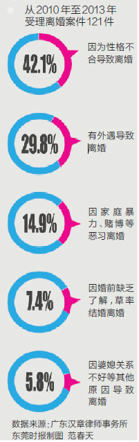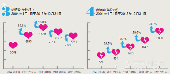 离婚 离婚后,男性比女性更容易再婚 市婚姻登记管理中心数据显示,最近10年来,主城区结婚夫妻增长率远远低于离婚增长率。 据图表,2004年1月1日至2013年12月31日期间,每两年一个时间段,主城区办理结婚的夫妻6009对、8193对、9568对、8832对、7964对。主城区登记结婚数量曲线为“抛物线”。最大峰值出现在2008年1月1日至2009年12月31日这个时段,为9568对(详见图表3)。 “推测几个原因。2008年至2009年当时盛传‘双春加闰月’,难得好年份。同时,2008年8月8日以及2009年9月9日这些被传为好意头大日子,当时也是扎堆结婚。以2009年9月9日为例,仅一日办理600多对结婚,相当于平日结婚量20-30倍。”市婚姻登记管理中心副主任钟小燕说。 对于最近两年结婚数量下降,钟小燕表示不好推测,有可能青年离开东莞,有可能是晚婚现象加剧。 专家分析 男性再婚人数 高于同一时段女性再婚人数 ——东莞理工学院城市学院宣传部部长 何鹏举 2004年至2013年,10年分为五个时间段,每个时间段男性再婚人数都高于同一时段女性再婚人数。这说明,男性离婚后比女性离婚后更容易再婚。 同时,我发现一个有趣现象:2004年1月1日至2005年12月31日,女性再婚人数占男性再婚人数比重为54.8%,2006年1月1日至2007年12月31日,这个参数的比例为57.5%,2008年1月1日至2009年12月31日为59.8%,2010年1月1日至2011年12月31日为61.7%……(详见图表5和图表6) 通过同时间段,女性再婚人数与男性再婚人数的比对,我们发现,这个比值一直在上升。这说明女性离婚后再婚越来越容易了,这也是女性独立和地位提升的一个现象。 更注重婚姻质量,幸福期望更高 ——深圳大学法学院社会学系教授 易松国 离婚率上升是国内大多数城市的共性,也是城市化进程中必然的社会现象。可以从几个角度去看待它。一方面,以往婚姻中“从一而终”观念正在淡化,现代夫妻更注重婚姻质量本身,为了孩子,为了家庭完整委曲求全的现象正在减少。 过去,离婚容易受歧视。如今,社会对离婚的认识更多元化,评价标准也更宽容了。离婚者不需要承受太大的社会舆论压力。 还有一个因素不容忽视,现代女性经济独立。有自己的事业和生活圈子的现代女性,不会再对婚姻委曲求全。 此外,婚姻观念的变化也是一个原因。合得来就婚,合不来就分。现代青年对婚姻和家庭的观念更为随性和洒脱。 父辈插手空间少,离婚简单随性 ——东莞理工学院城市学院社会工作教研室 赖沛东 过去,很多婚想离最终离不成。有句话说,床头吵床尾和。现代社会家庭结构从多代同堂的传统家庭形式转换为以夫妻为中心的核心家庭形式。过去夫妻有矛盾,父辈、亲戚都会参与解决。这婚往往离不成。如今,这种夫妻本位的关系,家庭关系简单,离婚也变得简单和随性。 性格不合是夫妻离婚首要原因 ——广东汉章律师事务所律师 张富昌 办理离婚,通常只需15分钟。但是,每一对夫妻选择离婚,都有种种无奈和遗憾。 去年底,广东汉章律师事务所向本报记者提供了一组统计数据。从2010年至2013年,该律师事务所受理离婚案件121件,其中,因为性格不合导致离婚的有51宗,占42.1%;有外遇导致离婚的有36宗,占29.8%;因家庭暴力、赌博等恶习离婚的有18宗,占14.9%;因婚前缺乏了解,草率结婚离婚的有9宗,占7.4%;因婆媳关系不好等其他原因导致离婚的有7宗,占5.8%。 (记者 蔡嘉莉 保雪莲)