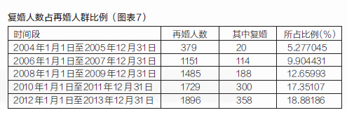 东莞时间网讯 辣妈诗诗昨天在微信圈里发了两个字:复婚。闺蜜留言说这是“母亲节”最好的礼物。 诗诗今年34岁,结婚五年,离婚半年。丈夫是高中同学,原本以为找到了真爱,却被老公一次酒后乱性辗落成泥。 半年来,诗诗心灰意冷,每每想到才两岁的孩子,心中隐隐作痛。思前想后,加上身边人的各种劝说,她做出了艰难的决定:复婚。“这是我最糊涂的决定,也希望是下半辈子最正确的决定。”诗诗说。 市婚姻登记管理中心提供的数据(主城区)显示:复婚的人越来越多。从2004年1月起,每两年复婚人数分别为:20人、114人、188人、300人、358人。“我们遇到过来这里四次的。结婚后来办离婚,又来办复婚,前不久又来办离婚。”市婚姻登记管理中心副主任钟小燕说。 复婚 离婚多因一时冲动 复婚比例逐年增加 “有多少爱可以重来?有多少人值得等待……”迪克牛仔的歌声回荡在记者的耳边。现实生活中,到底有多少爱可以重来,又有多少婚离错了? 这个问题可以用一组数据来回答:2012年1月1日至2013年12月31日,主城区(南城、东城、莞城、万江)有358人复婚。这意味着,东莞主城区平均每隔一天就有1人复婚。 2004年至2005年,复婚20人,同时段再婚人数379人,复婚占再婚总人数5.277%;2006年至2007年,复婚114人,同时段再婚1151人,复婚占再婚总人数比为9.904%……(详见图表7)。数据显示:从2004年至2013年,复婚群体占同时段再婚总人数的比重呈上升趋势。 “我们遇到过来这四次的。结婚后来办离婚,又来办复婚,前不久又来办离婚。”市婚姻登记管理中心副主任钟小燕告诉记者,具体姓名不方便透露。但是这种一时冲动离婚后来又复婚的情况,大家也是常见不怪。 相关案例 复婚,一个隐隐作痛的决定 广东省婚姻家庭咨询师协会副会长、东莞泰诺婚姻家庭咨询中心负责人刘欣向本报记者分享了一个真实的故事。 美玲(化名)和小周去年9月份相亲,10月份同居并登记结婚。12月底就办了离婚手续。这段婚姻维持了两个月。 而导致离婚的原因竟然是礼金问题。夫妻俩因男方送给女方的礼金归谁没协商好,本该筹办的“结婚典礼”取消了,婚姻也随之宣告终结。 今年元旦后,美玲后悔了,希望挽回婚姻。但是男方父母坚决不同意。无助之下,美玲求助婚姻家庭咨询中心。 刘欣说,如果他们不冲动,或者他们在遇到问题时懂得去寻求专业人士帮助,也许不会走到这一步。 而就在昨天,辣妈诗诗在微信圈里发了两个字:复婚。闺蜜留言说这是“母亲节”最好的礼物。 诗诗今年34岁,结婚五年,离婚半年。丈夫是高中同学,原本以为找到了真爱,却被老公一次酒后乱性辗落成泥。 半年来,每每想到才两岁的孩子,诗诗心中隐隐作痛,思前想后,做出了艰难的决定:复婚。 “这是我最糊涂的决定,也希望是下半辈子最正确的决定。”诗诗说。 专家分析 现代夫妻对“不和谐”容忍度低 ——深圳大学法学院社会学系教授 易松国 许多年轻夫妻对婚姻经营还缺乏经验。对夫妻间出现的“不和谐”的容忍度低。夫妻间出现矛盾后,缺乏理性解决的方法,容易导致草率离婚,等后悔时,因为感情的链条还在,又很容易走上复婚的道路。 鼓励子女大胆试婚 ——东莞理工学院城市学院宣传部部长 何鹏举 等我的子女长大了,我要鼓励他们大胆试婚。男女都是平等的,不存在女性吃亏的说法。