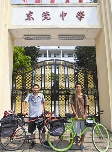 8月5日,经过27天的骑行,张颖钊(左)和莫灿钦顺利回到母校东莞中学。 (记者 李梦颖 摄)
