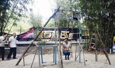让人奇怪的是,这些铁质的“健身设施”与平时在公园、小区内看到的略有不同,除了外表颜色略显单一外,周边还用了多根木棍和绳索加固。而篮球架和乒乓球台,也是用木板拼接钉制而成。在秋千架的栏杆上,还贴有几张用黑色笔手写的“友情提示”,提醒游客使用健身器材时,要注意安全以及爱护景区环境卫生等。