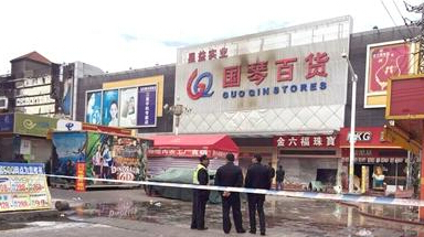 国琴百货一楼被烧得面目全非,二楼外面的招牌也被熏黑。在国琴百货两边,有药店、服装店、珠宝店、手机店,全部被烧得面目全非。