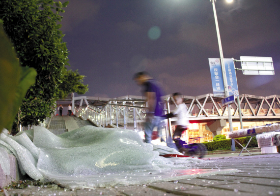 2日下午,记者来到万江华南MALL人行天桥,从外观上看,天桥主体部分已完工,但走近连接招商银行一侧天桥入口人行梯道台阶处,却发现堆积着一堆碎裂玻璃。拾级而上,玻璃栏杆“碎裂”事故不断上演。记者数了下,在两段台阶不足十米内,新装的玻璃栏杆竟有3块已碎裂。