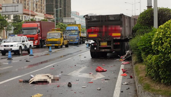 记者在西部干道绿福红绿灯处可以看到,事故现场非常惨烈,摩托车司机当场身亡,而肇事的大货车的车头已经冲上中间的隔离绿化带,交警正在现场对事故进行勘查。被撞的摩托车已经被完全撞得变了形。而事故中的白色小轿车,与大货车头碰头,停在旁边相向的车道,车头严重损毁,右转灯还在闪着。