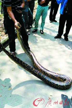 随后,记者从东莞市森林公安分局获悉,事发后,榴花公园管理处已向东城公安分局报警。东莞市森林公安分局介绍,经确认,该蟒蛇为野生蟒蛇,系国家保护动物,将送到广州相关部门进行处理。 (记者 吴城华)(来源:广州日报)