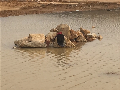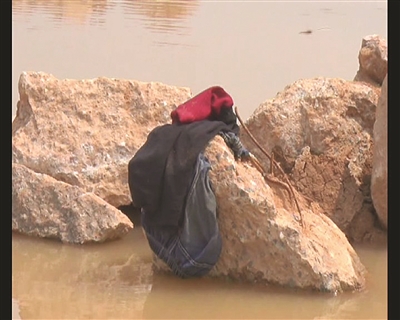 上图:落水孩子的衣服还留在上面。下图:水塘中间的石堆。