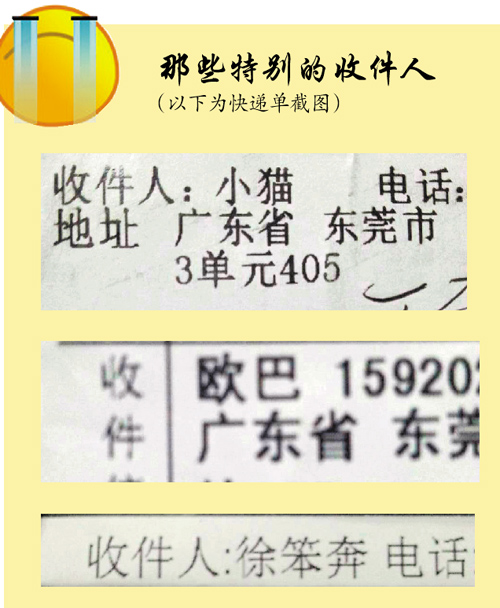 王辉在东莞东城区某小区经营一家快递点,从业几年来,王辉也碰到了不少奇葩收件人。“最经常送的是一个叫‘小猫’的客户,每周都有东西要送。”王辉告诉记者,第一次给“小猫”送快递时自己乐坏了,“起这么可爱的名字,我还以为是个姑娘,没想到过去一看是个大老爷们。”