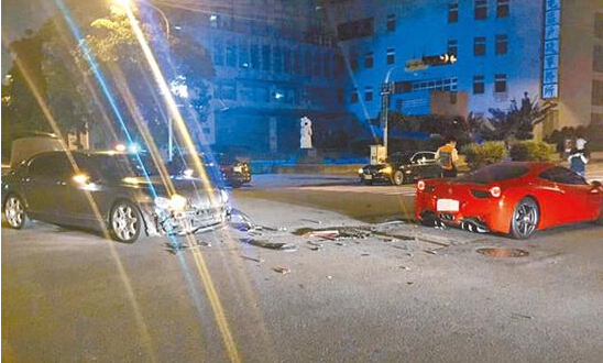 在彰化县执业的周姓牙医师,5日晚间和友人小聚,喝了3杯威士忌后,开着价值1400万(新台币,下同)、车号8889的法拉利上路,行经台中市政北二路和朝贵路口时,和一辆价值1500万、车号9888的宾利车相撞,宾利车头毁,法拉利左车身严重凹陷,2车修缮费用初估近千万,令人咋舌,周姓牙医也被警方依公共危险送办。