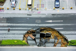 后果:形成面积80多平方米、深达3米的塌坑,一辆停泊的空商务车掉落坑底,无人员伤亡。
