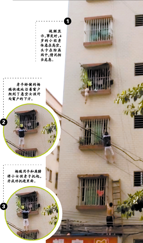 这时,孩子开始哭着喊妈妈。杨瑞发现,女孩全身都湿透了,且脸色发白,于是他安抚女孩,叫她不要害怕,让她往上爬,但孩子实在没有力气爬了。杨瑞于是设法将女孩的双脚放在自己的肩膀上,同时,他用另一只手托着孩子的屁股,一点一点往上面推。经过努力,杨瑞终于成功把女孩从防盗网外托起,进入到防盗网内。