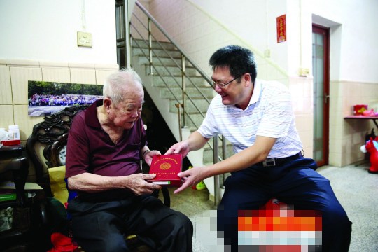 在9月3日的阅兵前夕,寮步当地政府不仅为老人送上慰问金,还为老人送上由国家授予的中国人民抗日战争70周年纪念章,这圆了老人一生最大的心愿。