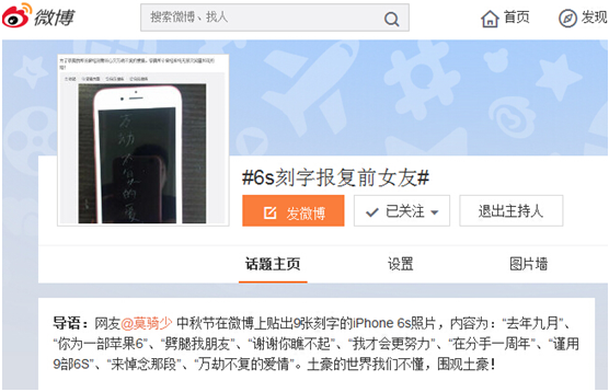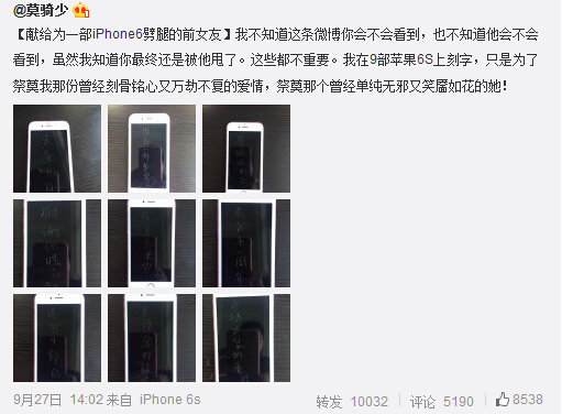 看了小伙在iPhone6s屏幕上刻的九句话,网友才恍然大悟,原来这位“莫骑少”确实与苹果“有仇”。该网友在自己的微博中爆料称,去年九月,其前女友因为一部苹果6与其分手并劈腿他的朋友,这令他十分难过,现在有实力买得起iPhone6s,就买9部刻字玩,意在让他的前女友看看“悔不当初”。