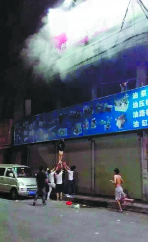 据目击者介绍,正在这时,街坊们听见楼上有人喊“救命”,是一名女子,众街坊冒险靠近小楼,一边鼓励女子顺着阳台滑下来,一边靠在一起,组成人体“气垫”,在下面接着。受到不小惊吓的女子起初十分犹豫,不敢下跳。情况越来越危急,经过众街坊的一再鼓励,女子终于一咬牙跳到人体“气垫”上。大家稳稳地接住她,把她送到安全地带。