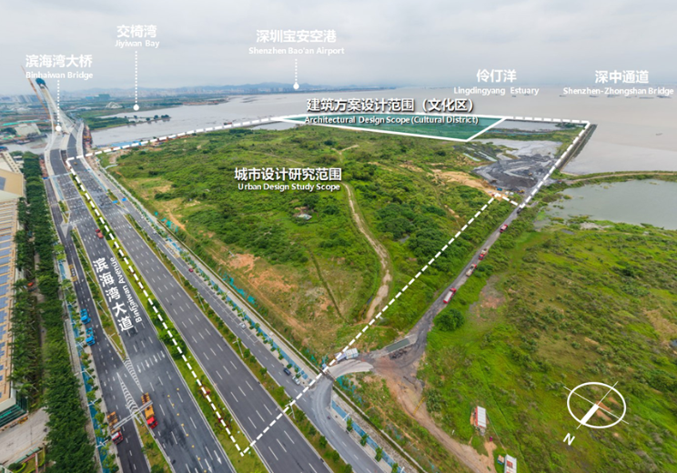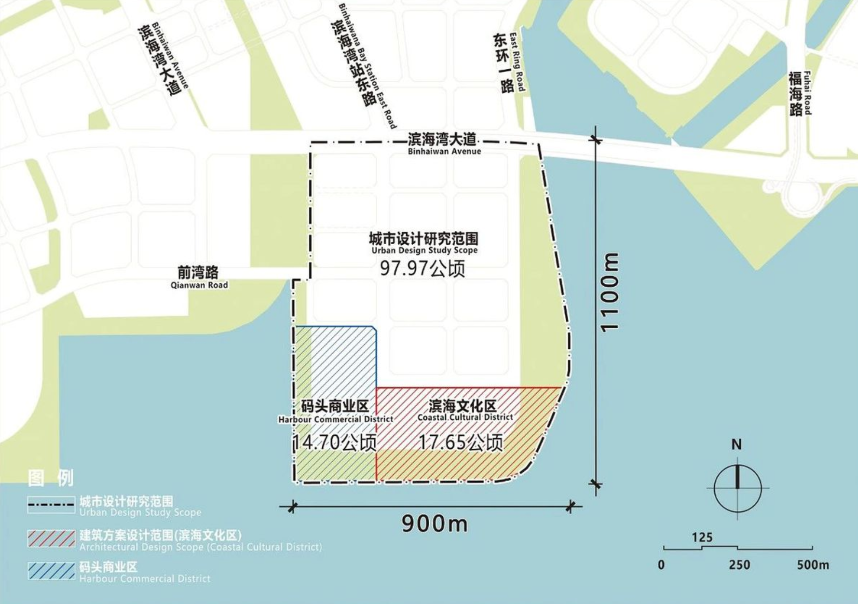 本次竞赛设计范围包括城市设计研究范围与建筑方案设计范围。其中,城市设计研究范围位于滨海湾大道以南的半岛地区,面积约97.97公顷;建筑方案设计范围位于片区最南端的滨海文化区,面积约17.65公顷。